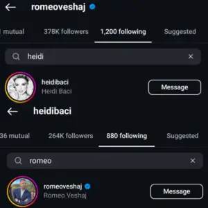 Dhe si të mos mjaftonte kjo, një tjetër detaj ka ndezur edhe më shumë dyshimet: Romeo dhe Heidi kanë nisur sërish të ndjekin njëri-tjetrin në Instagram. Një veprim i vogël për disa, por mjaft i zhurmshëm për ata që ndjekin nga afër çdo lëvizje të tyre.