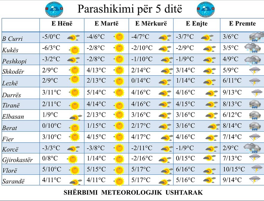 Kjo situatë me vlera jo normale dhe atipike për stinën që ndodhemi vjen si pasojë e anomalive të motit, duke na dhënë një ‘shije’ të një jave pranverore, por kjo situatë ndryshon të premten ku parashikohet rikthim i reshjeve të shiut në të gjithë territorin.