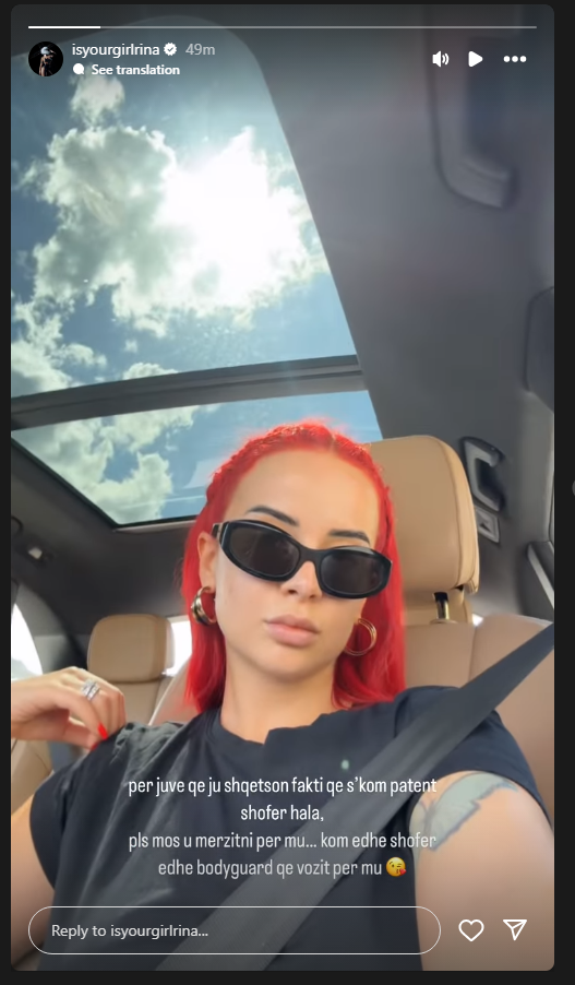 Në një postim në rrjetet sociale, ajo ka shkruar: “Mos u mërzitni për mu, kom shofer edhe bodyguard që vozit për mu”, duke lënë të kuptohet se lëvizjet e saj janë gjithmonë të sigurta dhe luksoze.