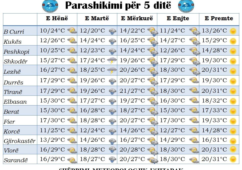 Në vëmendje duhet patur zona e veriperëndimit ku reshjet parashikohen me intensitet mesatar deri dhe të lartë në formën e rrebesheve shoqëruar me shkarkesa elektrike.