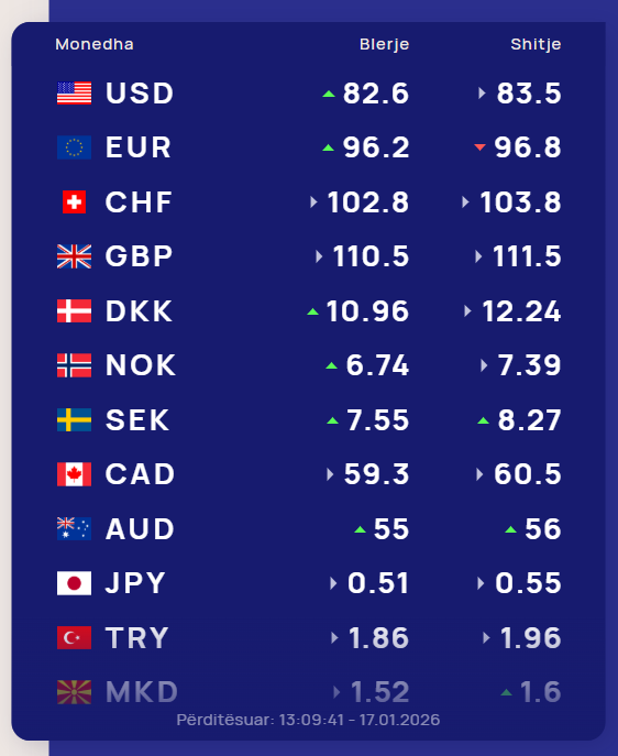 Kurset kryesore të këmbimit valutor sot pasqyrojnë lëvizjet e tregut ndërkombëtar.