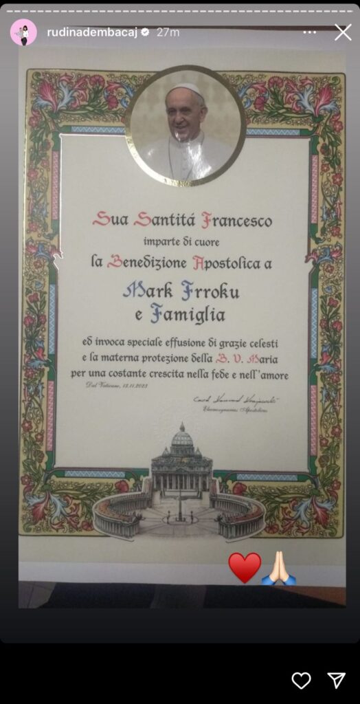 Aktorja e humorit Rudina Dembacaj, ka postuar në rrjetet e saj sociale në Instgram ku tregon që bashkëshorti, Mark Frroku dhe familja e saj kanë marrë bekimin Apostolik nga Papa Françesku.