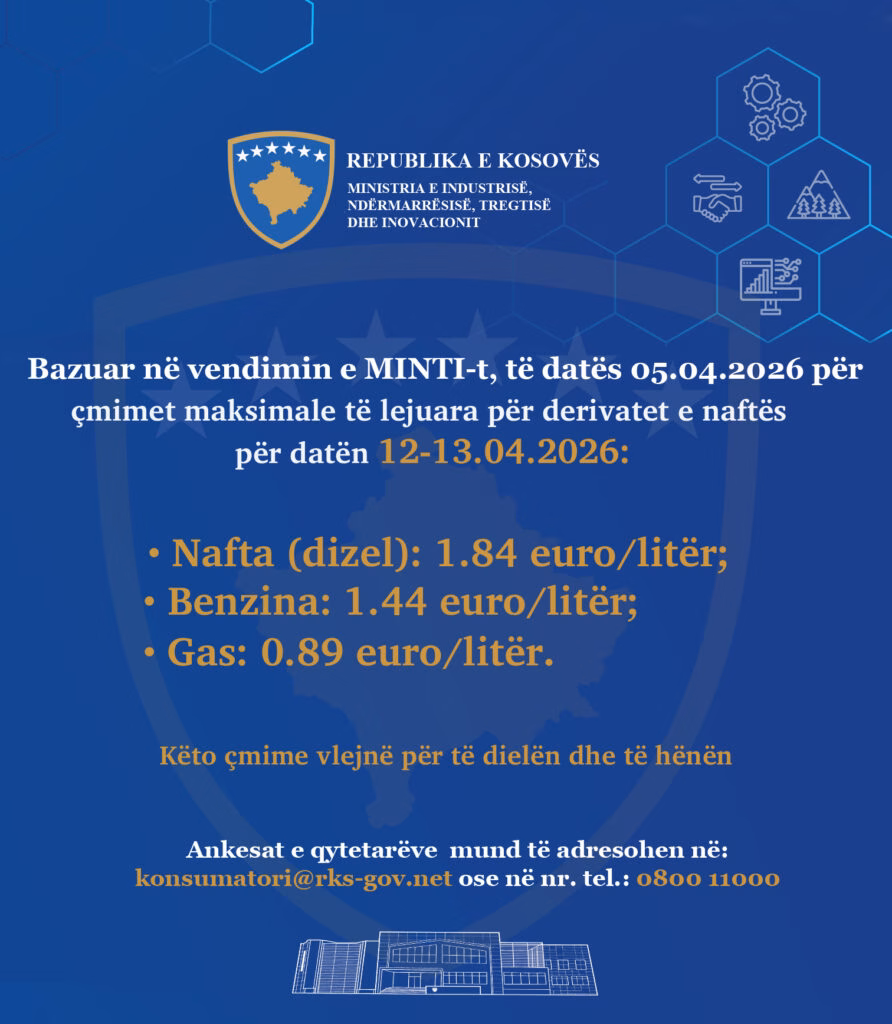 Ministria e Industrisë, Ndërmarrësisë dhe Tregtisë (MINT) ka publikuar çmimet maksimale të lejuara për derivatet e naftës për datën 13 prill 2026.