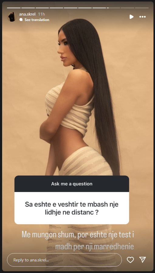 “Me mungon shum, po eshte nje test i madh per nji marredhenie”, shkroi ajo duke treguar që ka durim dhe ia vlen sakrifica për një person që e do.