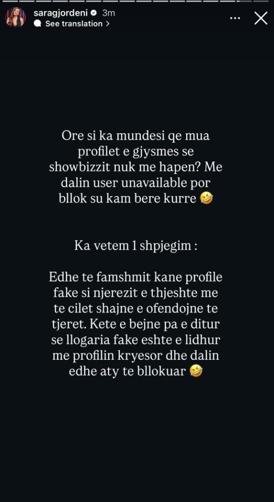 “Ka vetëm një shpjegim,” shkruan Sara. “Edhe të famshmit kanë profile fake si njerëzit e thjeshtë, me të cilët shajnë e ofendojnë të tjerët. Këtë e bëjnë pa e ditur se llogaria fake është e lidhur me profilin kryesor dhe dalin edhe aty të bllokuar.”