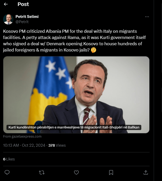 “Kryeministri i Kosovës kritikoi kryeministrin e Shqipërisë për marrëveshjen me Italinë rreth objekteve të emigrantëve. Një sulm i ulët ndaj Ramës, pasi që ishte vetë Qeveria Kurti që nënshkroi marrëveshje me Danimarkën duke hapur Kosovën për të strehuar qindra të huaj dhe emigrantë të burgosur në burgjet e Kosovës.” – ka shkruar ai.