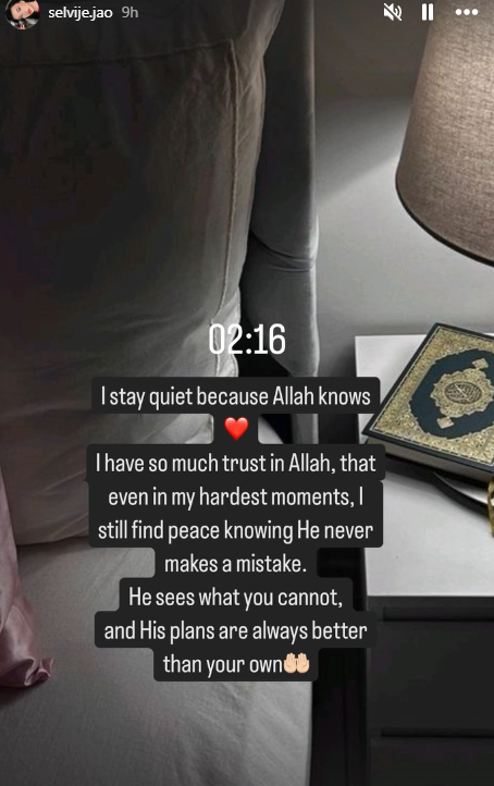 “Qëndroj e qetë sepse Allahu di. Kam aq shumë besim në Allah, sa edhe në momentet më të vështira, gjej paqe duke ditur se Ai nuk bën asnjëherë gabim,” shkruan Selvija, krahas një fotografie që shfaq një Kuran mbi një komodinë pranë shtratit.