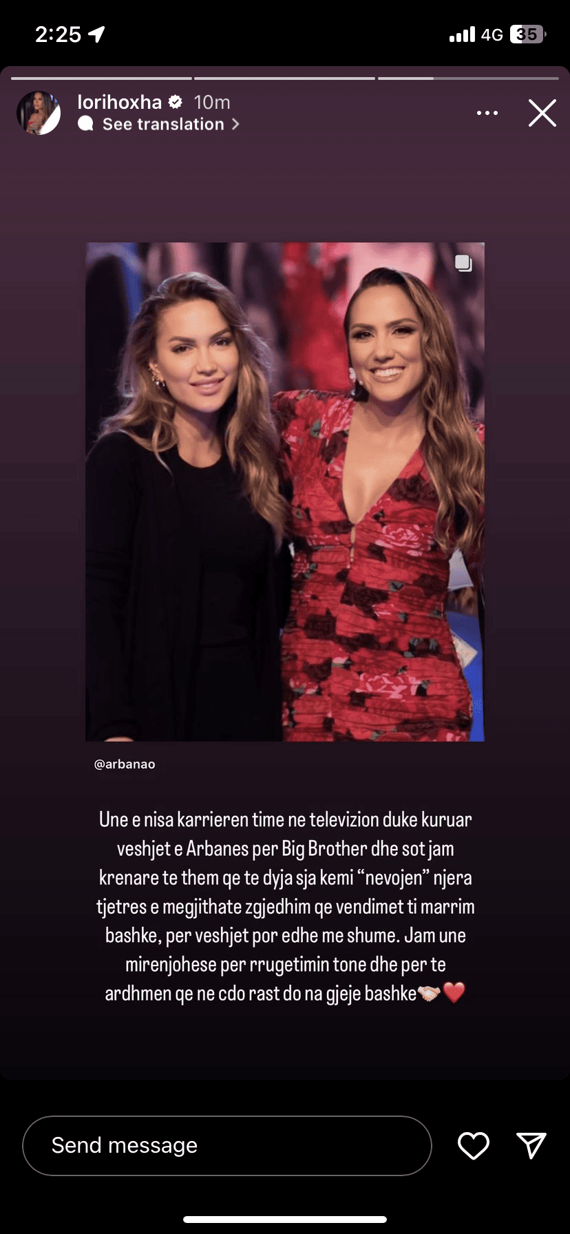 Ajo ka postuar një foto në InstaStory ku shkruan: “Unë e nisa karrierën time në televizion duke kuruar veshjet e Arbanës për Big Brother dhe sot jam krenare të them që të dyja s’ja kemi nevojën njëera-tjetrës e megjithatë zgjedhim që vendimet ti marrim bashkë, për veshjet por dhe më shumë. Jam unë mirënjohëse për rrugëtimin tonë dhe për të ardhmen që në çdo rast do na gjejë bashkë”.