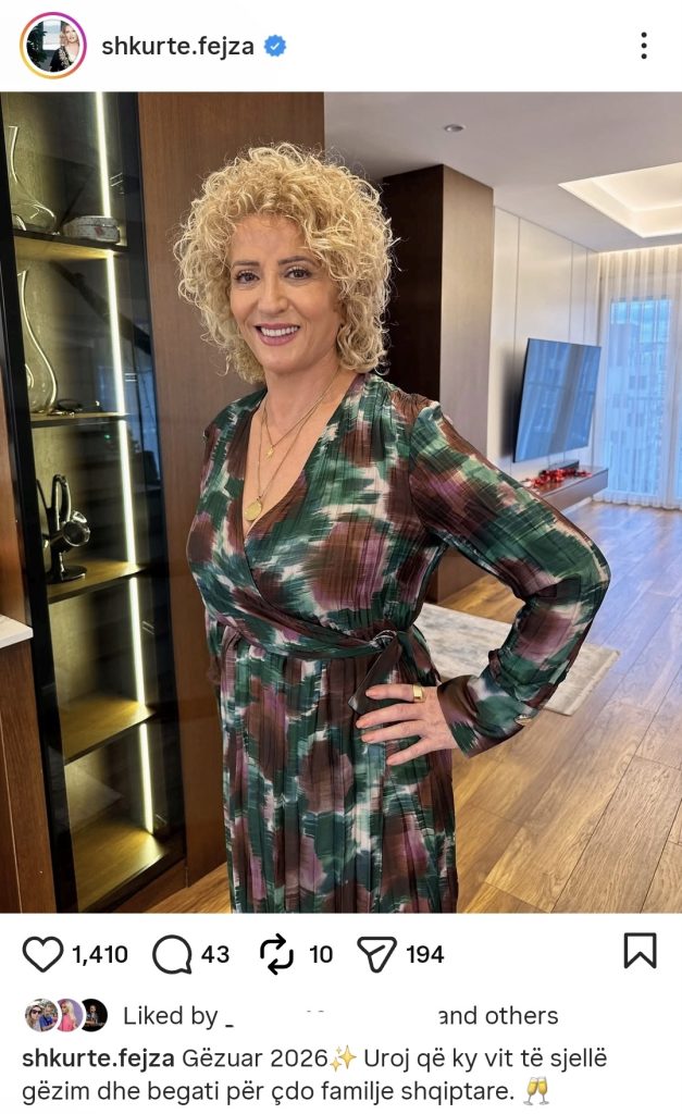 Në urimin e saj, Shkurte Fejza shkroi: “Gëzuar 2026✨ Uroj që ky vit të sjellë gëzim dhe begati për çdo familje shqiptare.”