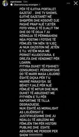 Nëpërmjet një Instastory, ish-partnerja Egesta u ka bërë thirrje publike mediave dhe njerëzve që të ndalojnë se përdoruri fotografinë dhe djalin e tyre të mitur.