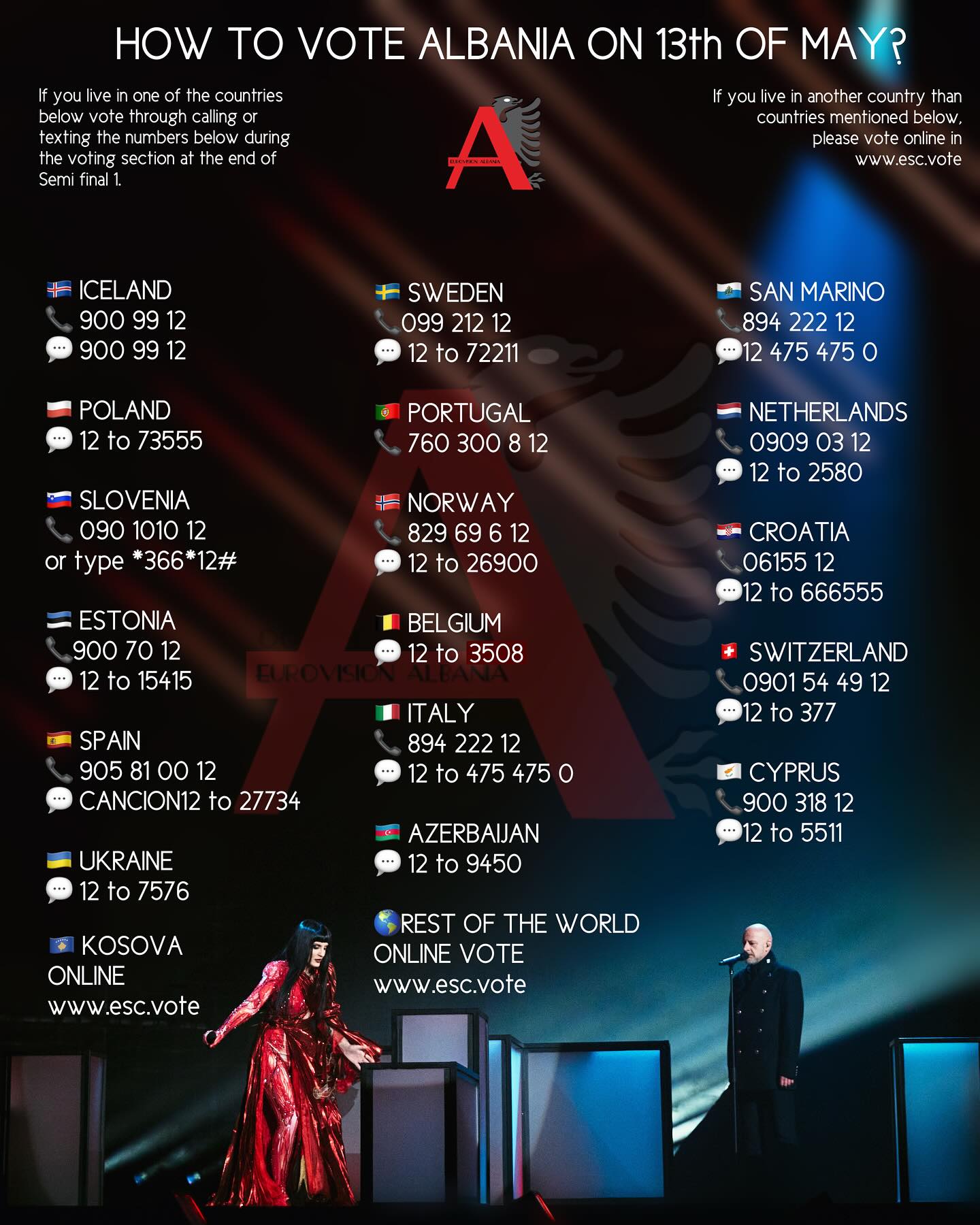 Grupi Shkodra Elektronike performuan të 12-tët në garë, me ç’rast edhe kodi i tyre i votimit është 12 dhe për të gjithë shqiptarët që duan të votojnë, duhet të dërgojnë kodin 12 nga shtetet në të cilat jetojnë.