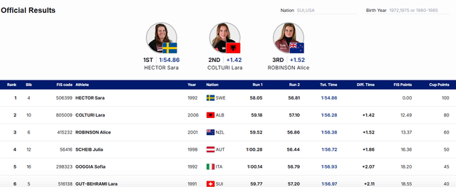 Ajo ka arritur të renditet e dyta në disiplinën e sllallomit të madh me një kohë totale prej 1:56.28 dhe me një diferencë të vogël nga Sara Hector e vendit të parë.