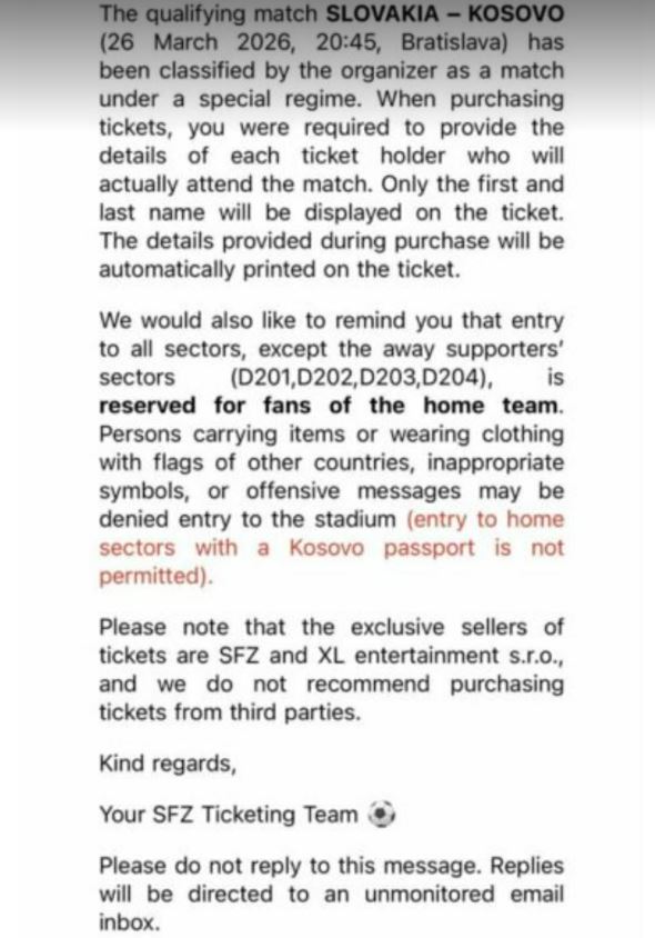 “Ju informojmë se hyrja në të gjitha sektorët, përpos atij të tifozëve mysafirë, janë të rezervuar për tifozët e ekipit vendës. Personat që mbajnë pankarta ose veshin fanella me flamuj të vendeve të tjera, simbole të papranueshme ose mesazhe ofenduese, do të ndalohen së hyri në stadium. Hyrja në sektorët e vendësve me pasaporta të Kosovës nuk do të lejohet”, shkruan në njoftimin e Federatës Sllovake.