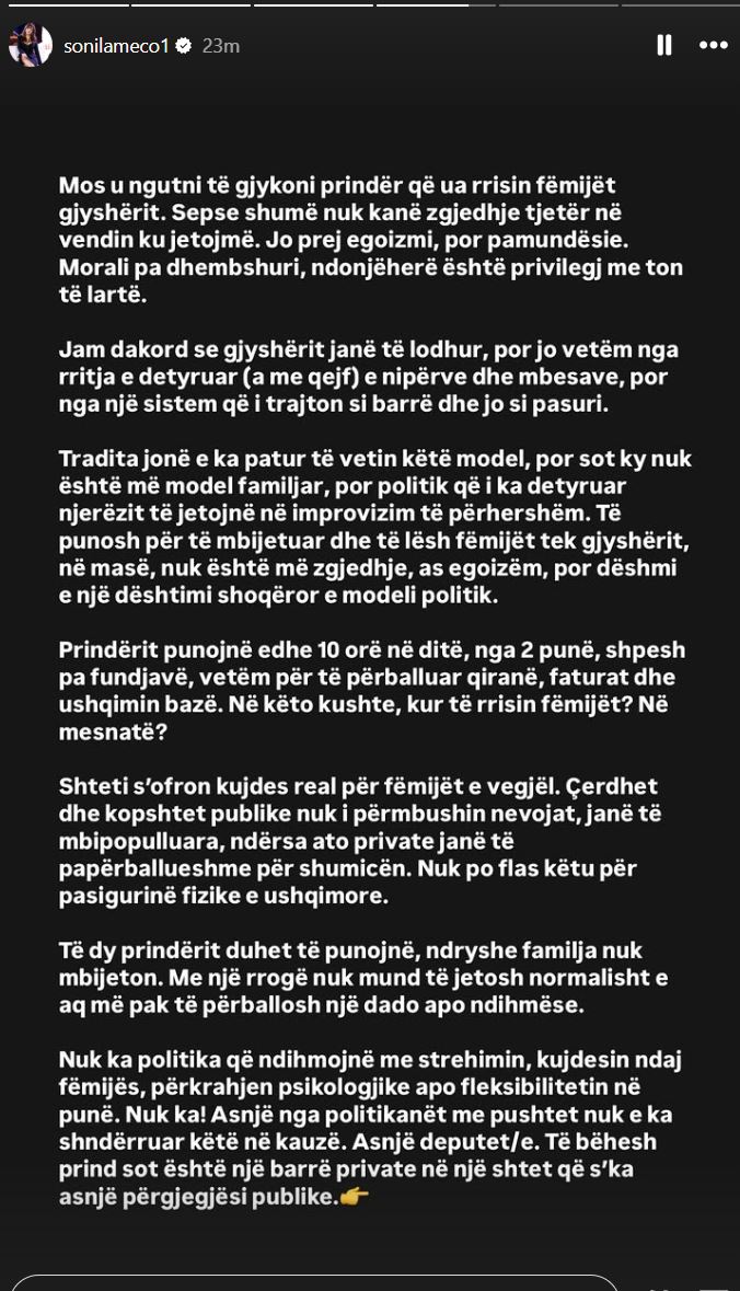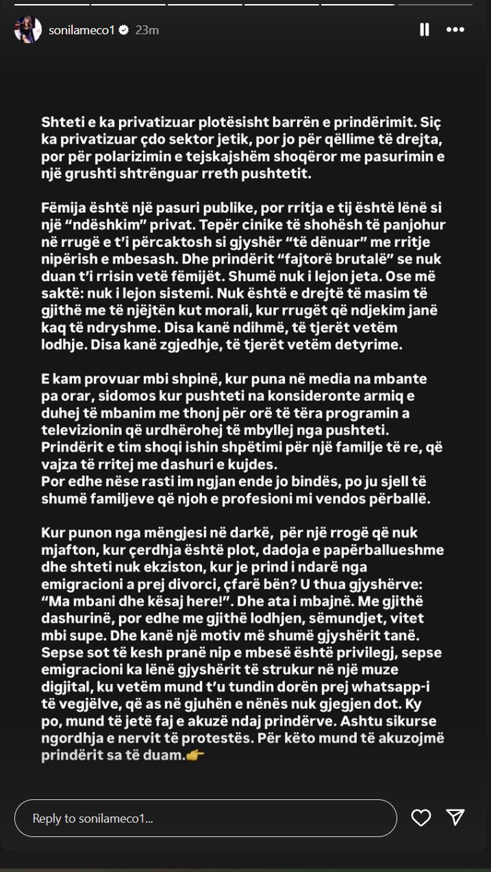 Në këtë polemikë është përfshirë edhe gazetarja e njohur Sonila Meço, e cila ka reaguar me një mesazh të gjatë dhe prekës, ku rrëfen përvojën e saj si nënë, gazetare dhe pjesë e një sistemi që – siç thotë ajo – ka privatizuar plotësisht barrën e prindërimit.