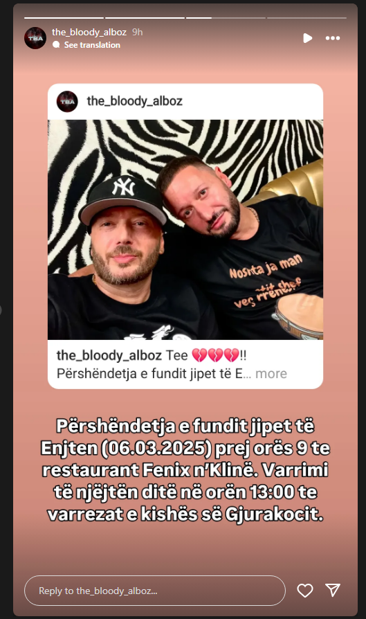 “Përshëndetja e fundit e jepet të enjten (06.03.2025) prej orës 9 te restorantin “Fenix” në Klinë. Varrimi të njëjtën ditë në orën 13:00 te varrezat e kishës së Gjurakocit”, thuhet në njoftim.