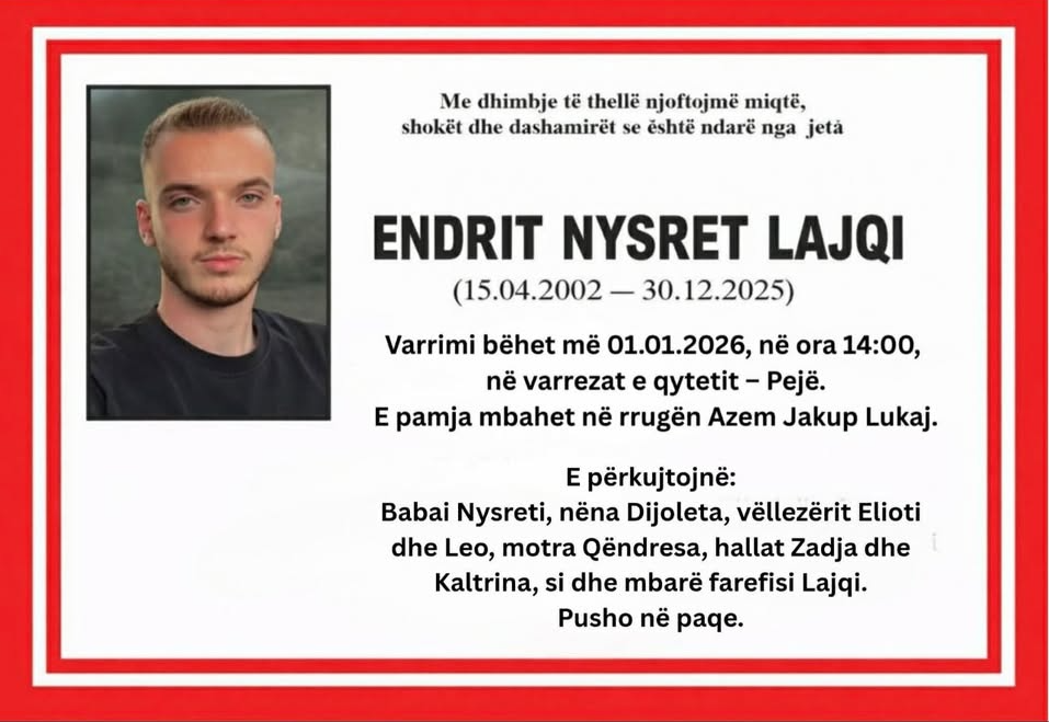 Njoftimin e kanë bërë familjarët e të ndjerit, të cilët kanë bërë të ditur se varrimi do të mbahet sot, me fillim nga ora 14:00, në varrezat e qytetit të Pejës.