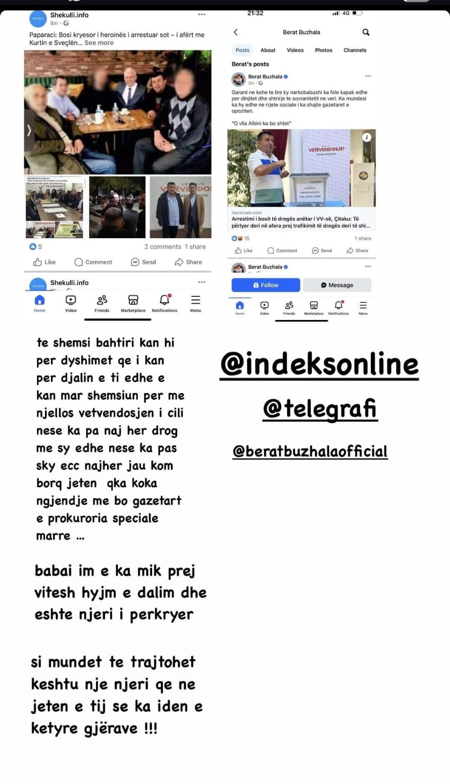 “Te Shemsi Bahtiri kanë hi për dyshimet që i kanë për djalin e tij… dhe e kanë marrë Shemsiun për me njollos Vetëvendosjen… nëse ka pa ndonjëherë drogë me sy, ua kam borxh jetën”, shkroi ai. Reperi deklaron me bindje se babai i mikut të tij është i pastër dhe s’e meriton këtë trajtim: