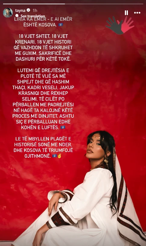 Këngëtarja Tayna është një ndër figurat që ka ndarë një mesazh të fuqishëm në Instagram, duke përkujtuar jo vetëm historinë e gjatë të Kosovës, por edhe sakrificat e bëra për lirinë dhe drejtësinë.