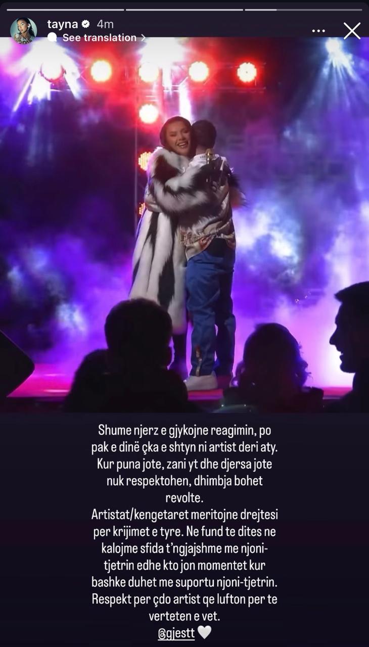 Duke ndarë një fotografi të ngrohtë ku dyshja shihen duke u përqafuar në skenë, Tayna ka dhënë një mesazh të thellë. Ajo theksoi se veprimet apo “gabimet” e artistëve shpesh gjykohen ashpër nga jashtë, por pak njerëz e kuptojnë zhgënjimin dhe padrejtësitë profesionale që i çojnë ata drejt atij reagimi.