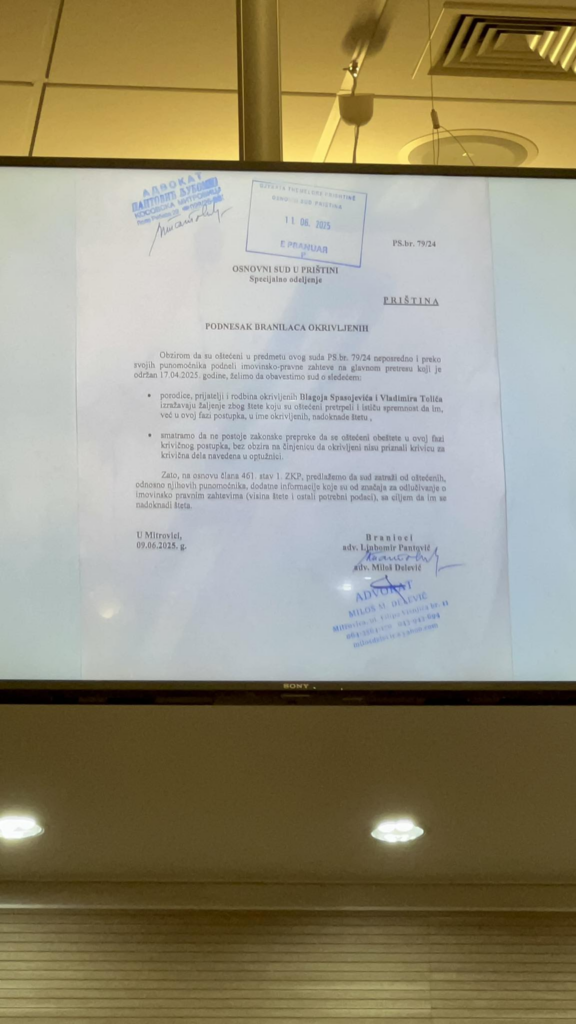 “Konsiderojmë se nuk ekzistojnë pengesa ligjore që të dëmtuarit të dëmshpërblehen në këtë fazë të procedurës penale, pavarësisht faktit se të pandehurit nuk e kanë pranuar fajësinë për veprat penale të përmendura në aktakuzë“, thuhet në dokumentin që është prezantuar.