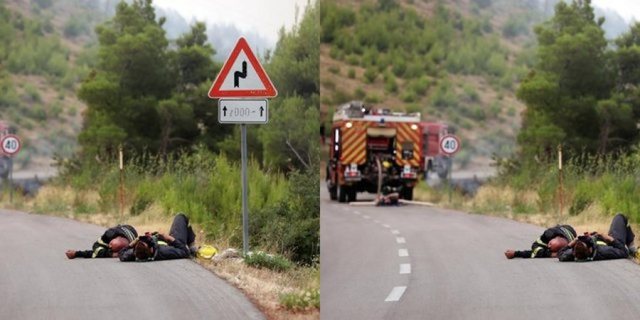 Një foto që po qarkullon në internet duken dy zjarrfikës të rraskapitur të cilët janë shtrirë në asflat pasi kanë luftuar me flakët gjithë natën.