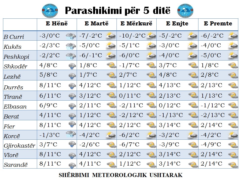 Për javën që presim përpara vendi ynë do të ndikohet nga kushte atmosferike kryesisht të qëndrueshme për shkak të masave ajrore të ftohta dhe relativisht të thata. Kjo situatë vjen si pasojë e qarkullimit për disa ditë të një qendre të presionit të ulët kryesisht mbi rajonin e Ballkanit.