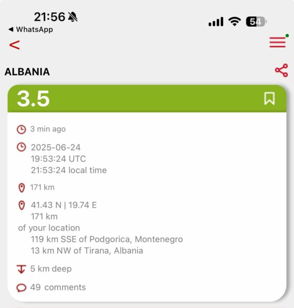 Një tërmet me magnitudë 3.5 të shkallës Rihter ka goditur Shqipërinë më vonë gjatë mbrëmjes së kaluar. Sipas të dhënave, tërmeti ka ndodhur në orën 21:53 sipas kohës lokale.