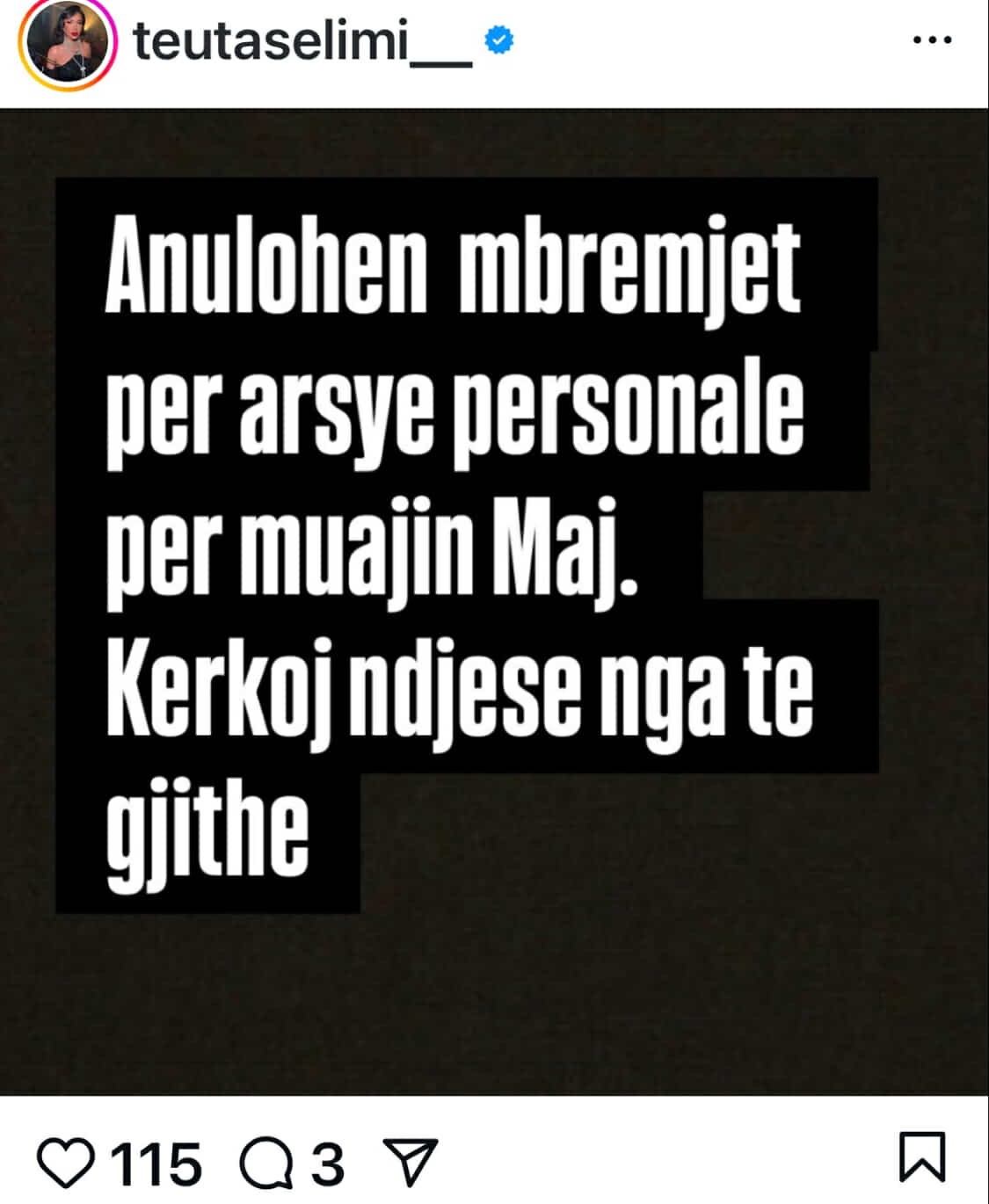 Këngëtarja e njohur Teuta Selimi ka njoftuar përmes rrjeteve sociale se të gjitha mbrëmjet muzikore të planifikuara për muajin maj do të anulohen për arsye personale.