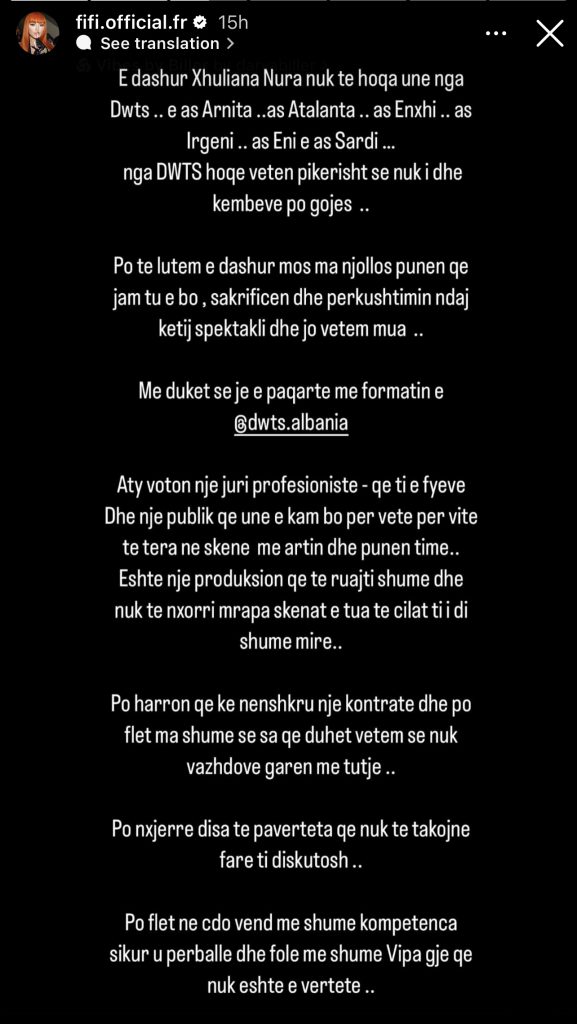 Fifi ka reaguar pas deklaratave të shumta që Juliana Nura ka bërë pas eliminimit nga “Dancing with the stars”. Juliana është shprehur e zhgënjyer nga juria dhe ndër të tjera ka përmendur edhe Fifin.