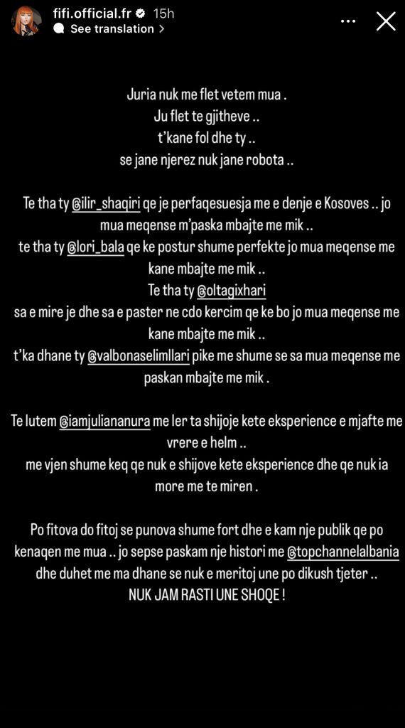 Fifi ka bërë një reagim në Instagram ku i ka bërë një thirrje publike Julianës që mos të tregojë histori të pavërteta dhe të njollosi emrin e asaj.