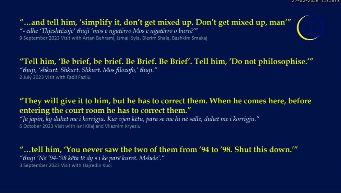Prokurori ka nxjerrë në ekran disa prej deklaratave që Hashim Thaçi ka bërë gjatë takimeve dhe bisedave që ka pasur me të akuzuarit për këtë rast dhe me persona të tjerë, e të cilat janë përgjuar.