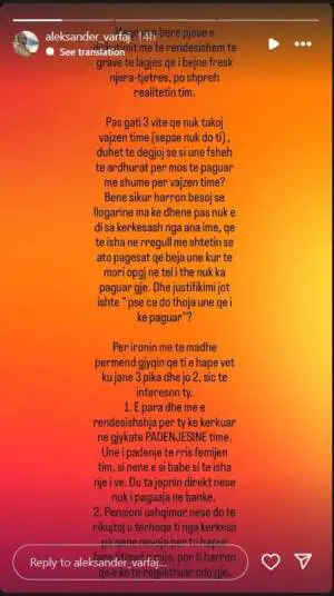 Ish-bashkëshorti i aktores Rudina Dembacaj, Aleksandër Varfaj, i është përgjigjur një deklarate të ish-gruas së tij, ku në fokus ka qenë çështja e fëmijës së tyre. Përgjigja e tij erdhi pasi Rudina foli për divorcin që ishte temë e programit që ajo moderon dhe akuzoi se ish-burrin se fsheh të ardhurat, duke mos dhënë sa i takon në bazë të tyre, pagesë për vajzën e tyre Viktoria.