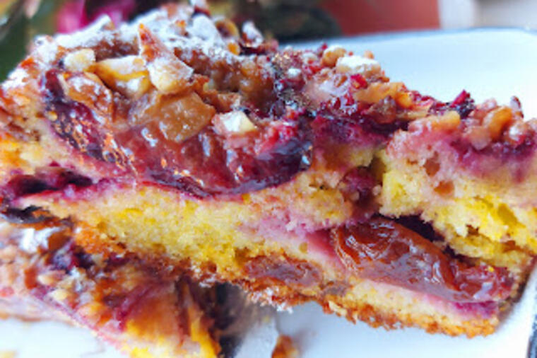 Kumbullat radhisni gjysmën dhe pjesën e mbetur të brumit rrafshojeni. Sipër qiteni pjesën tjetër të kumbullave.