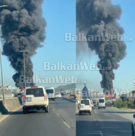 Siç duket edhe në pamjet e mëposhtme, mëngjesin e sotëm, në autostradën Tiranë-Durrës, një magazinë është pushtuar nga flakët.