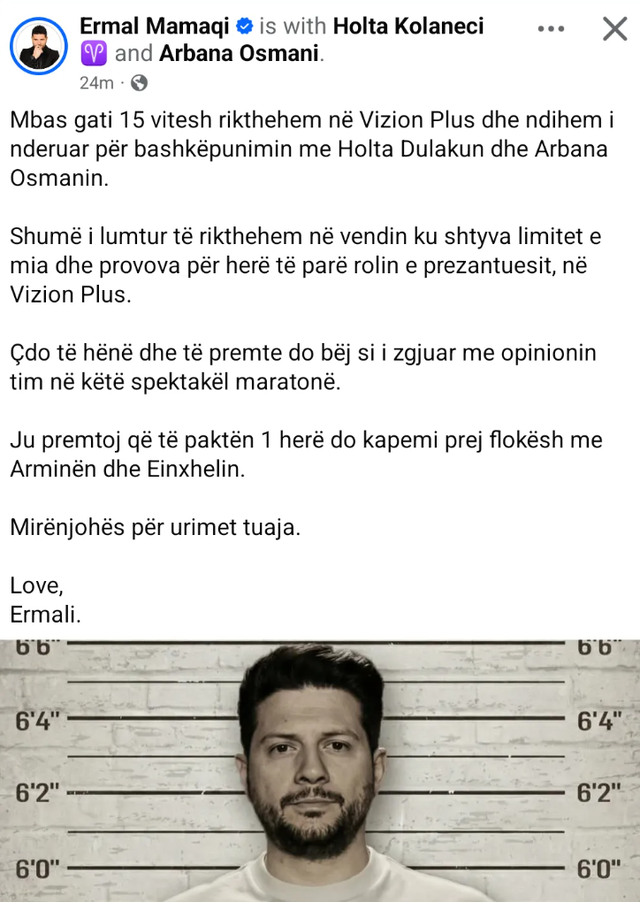 “Mbas gati 15 vitesh rikthehem në Vizion Plus dhe ndihem i nderuar për bashkëpunimin me Holta Dulakun dhe Arbana Osmanin. Shumë i lumtur të rikthehem në vendin ku shtyva limitet e mia dhe provova për herë të parë rolin e prezantuesit, në Vizion Plus. Çdo të hënë dhe të premte do bëj si i zgjuar me opinionin tim në këtë spektakël maratonë. Ju premtoj që të paktën 1 herë do kapemi prej flokësh me Arminën dhe Einxhelin. Mirënjohës për urimet tuaja. Love, Ermali.”