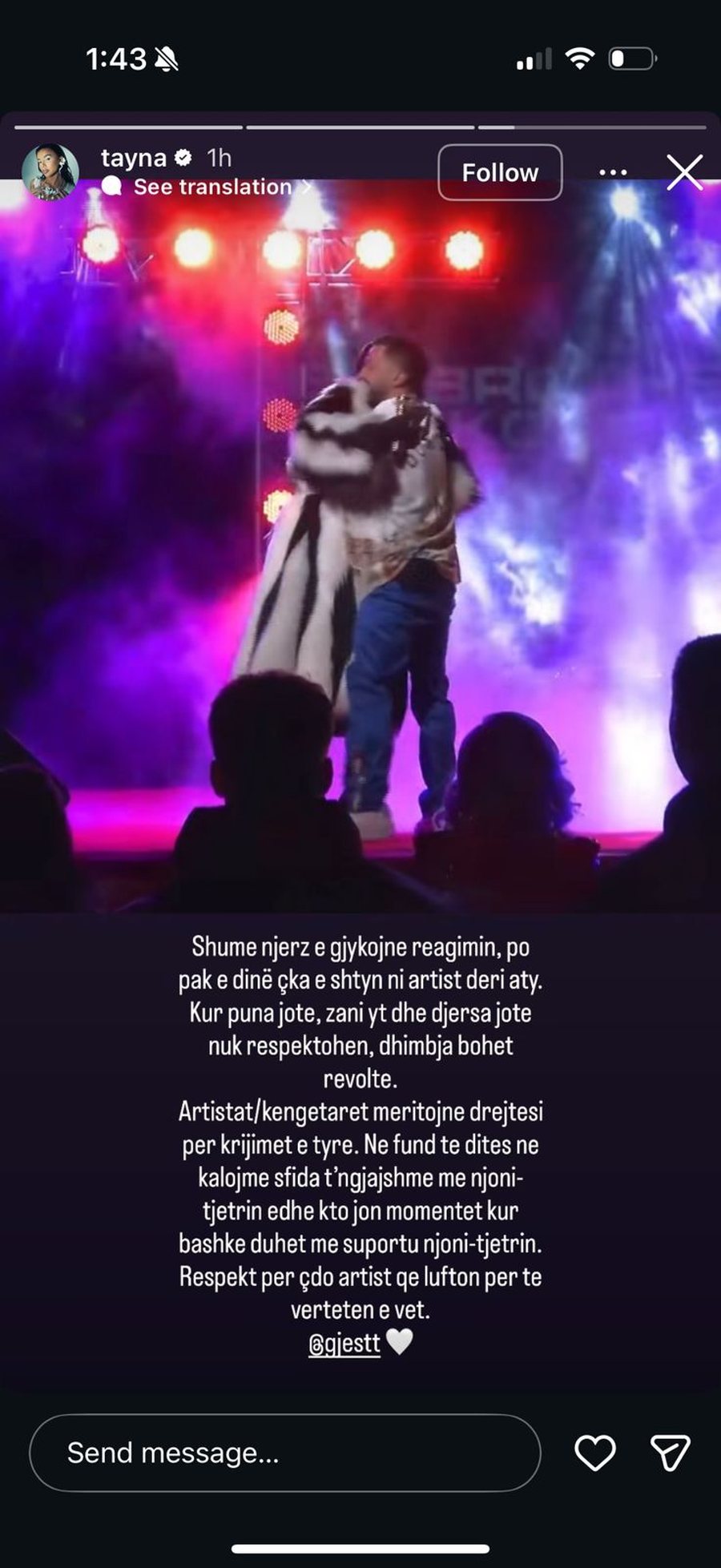 Përmes një Instastory Tayna shkroj se artistët meritojnë drejtësi për krijmet e tyre, duke shtuar se ata duhen vlerësuar.
