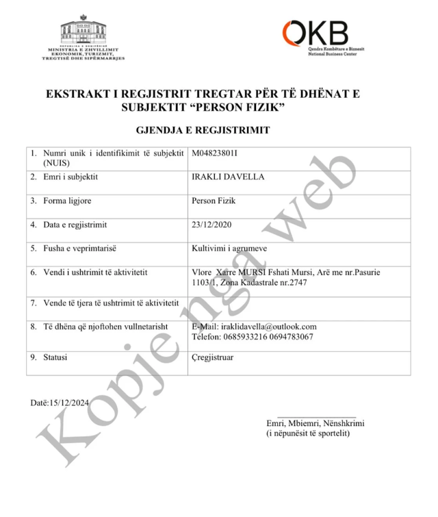 Gjithashtu në vitin 2020 ai rezulton të ketë regjistruar biznes në fshatin Xarrë të Bashkisë Konispol për kultivimin e agrumeve, i cili tashmë është çregjistruar.
