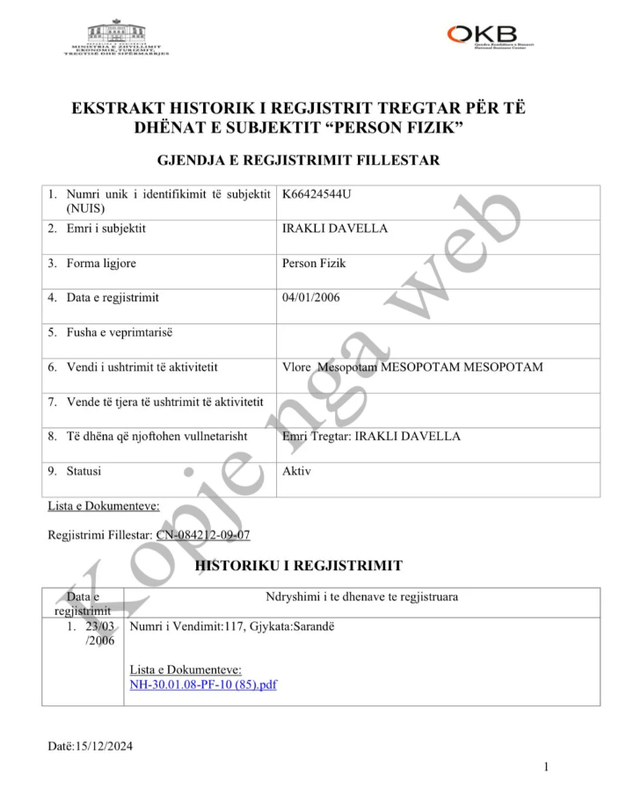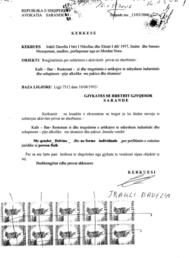Në vitin 2006 ai rezulton të ketë rregjistruar me vendim të Gjykatës së Sarandës, një biznes “Kafe-Bar-Restorant, si dhe tregëtimin e e artikujve të ndryshëm dhe ushqimor e pije alkoolike me pakicë dhe shumicë” në Delvinë, biznes i cili rezulton ende aktiv me NIPT K66424544U me qendër në Mesopotam, Bashkia Finiq.