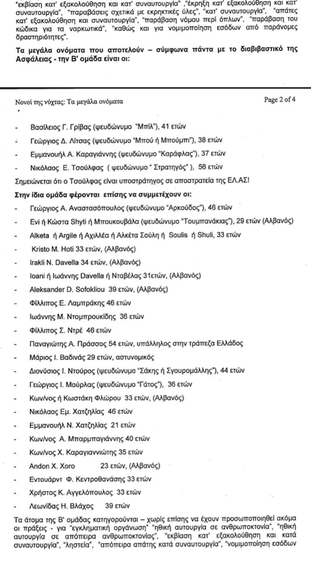 Mes të tjerash, në dokument, pasqyrohen emrat e pjesëtarëve të disa grupeve. Konkretisht në grupin e cilësuar “B”, ku përfshihen mafiozët grekë Vasilis Grivas (vrarë në 2017), Jorgos Litsas (vrarë në 2018) dhe Manolis Karaggianis (vrarë në 2018), rezulton edhe emri i Irakli N. Davella.