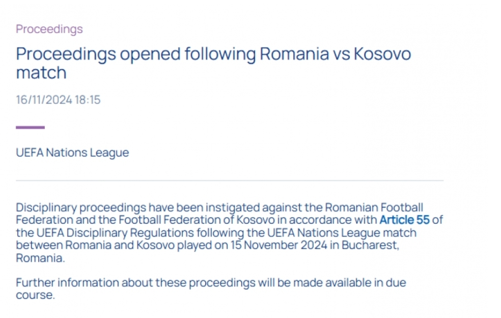“Procedura disiplinore është nisur kundër Federatës Rumune të Futbollit dhe Federatës së Futbollit të Kosovës në përputhje me nenin 55 të Rregullores Disiplinore të UEFA-s pas ndeshjes së Ligës së Kombeve të UEFA-s ndërmjet Rumanisë dhe Kosovës të luajtur më 15 nëntor 2024 në Bukuresht, Rumani”, thuhet një njoftim.
