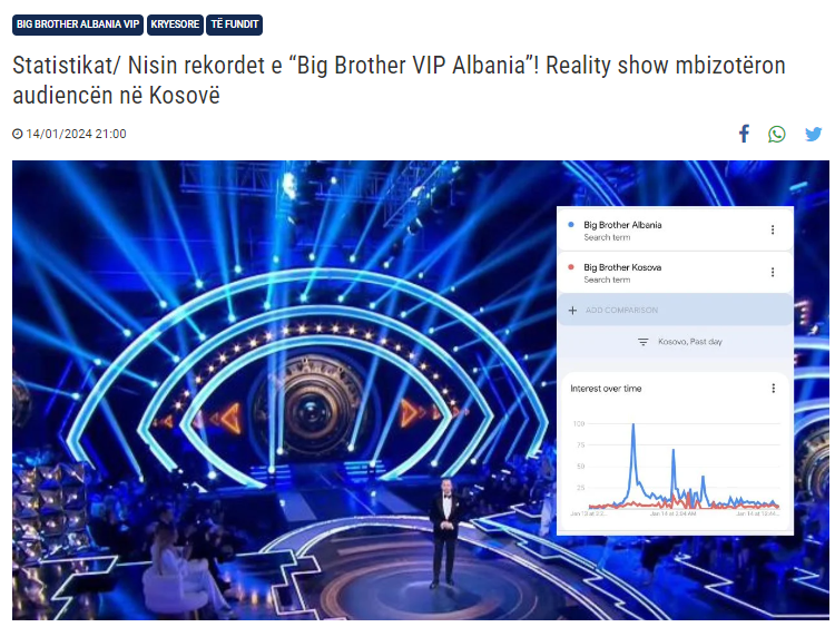 “Statistikat/ Nisin rekordet e “Big Brother VIP Albania”! Reality show mbizotëron audiencën në Kosovë”, thuhet në artikull, shoqëruar edhe me ‘fakte’.