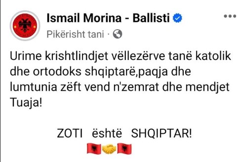 “Urime krishtlindjet vëllezërve tanë katolik dhe ortodoks shqiptarë, paqja dhe lumtunia zëft vend n’zemrat dhe mendjet tuaja! ZOTI është SHQIPTAR!”– shkruan Ballisti.