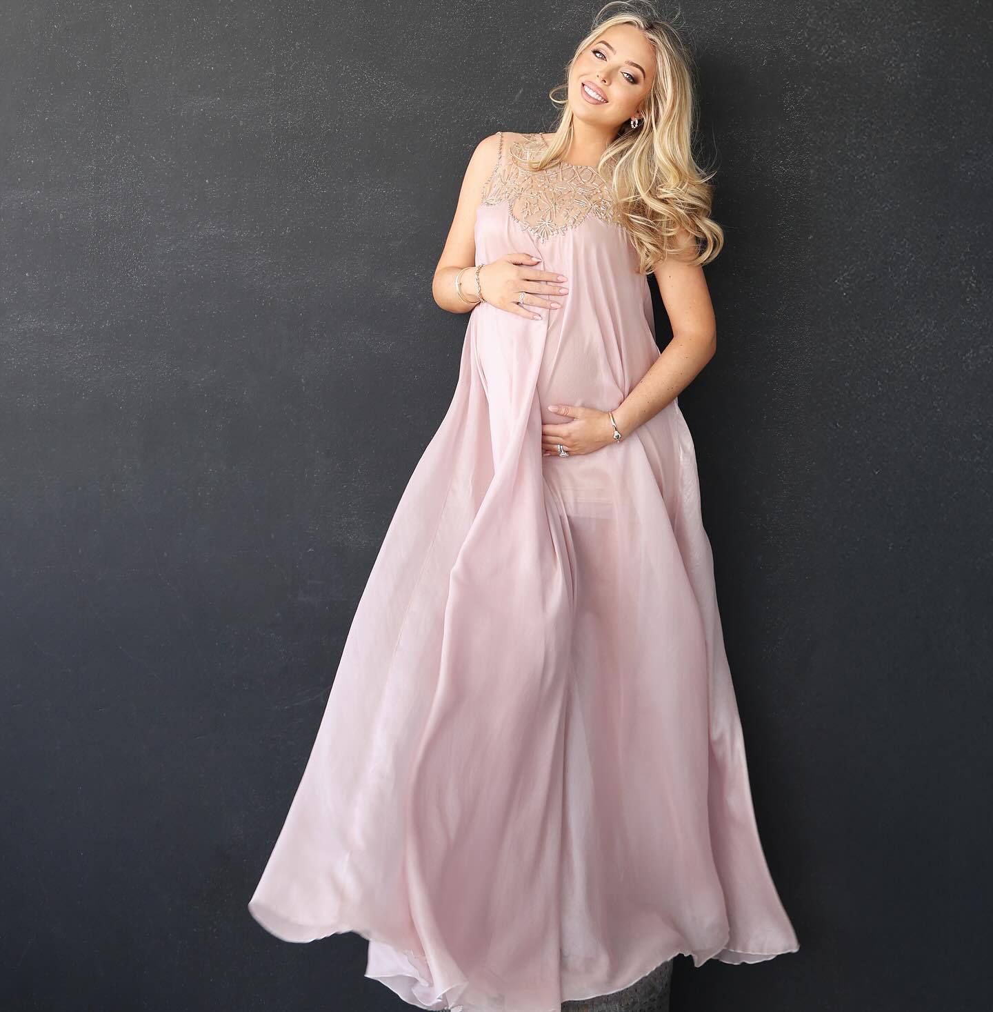 E veshur me një fustan elegant rozë dhe duke përqafuar barkun e saj të rrumbullakosur, Tiffany paraqitet në një dritë plot ndjeshmëri dhe elegancë – një homazh i bukurisë së nënës së ardhshme.