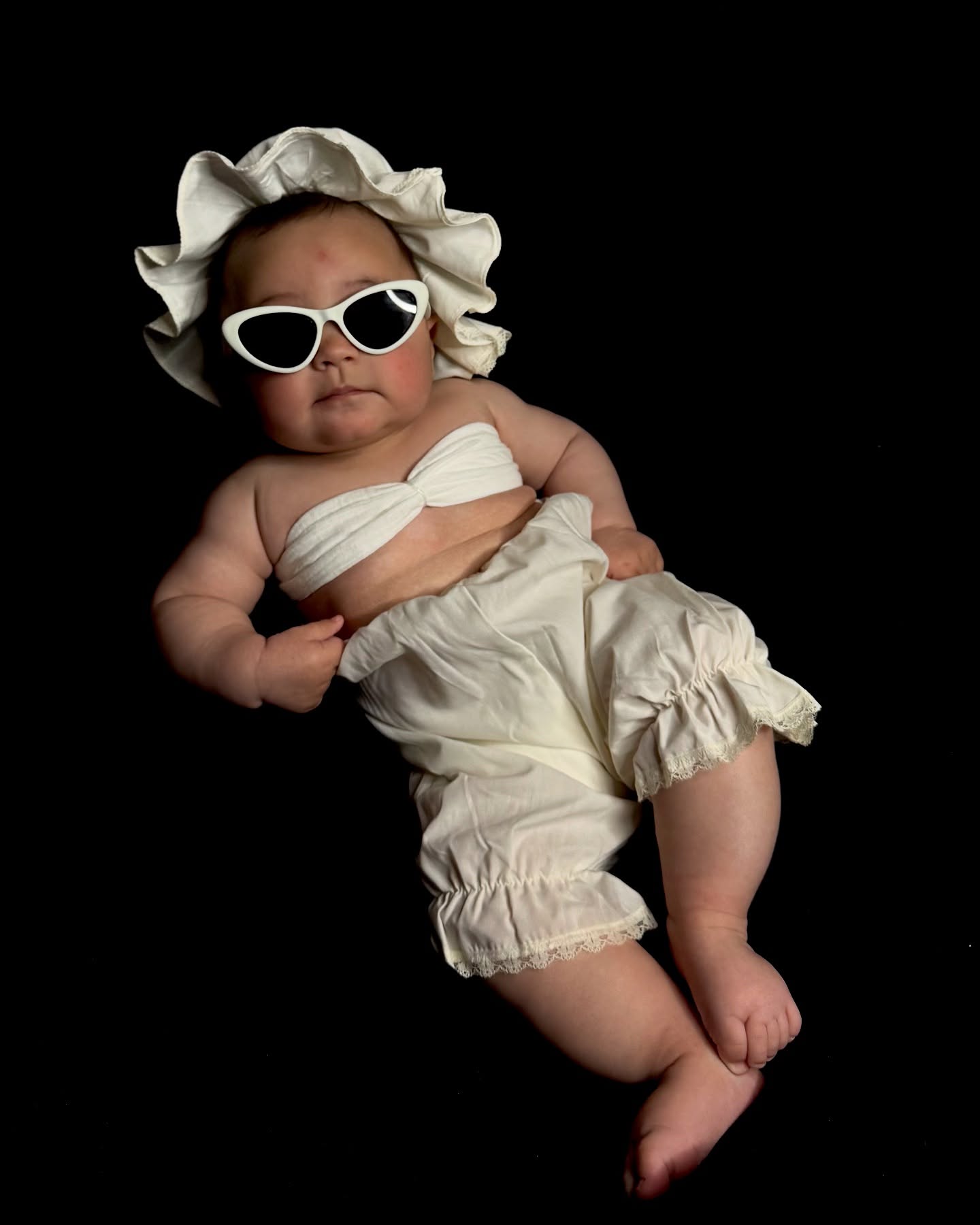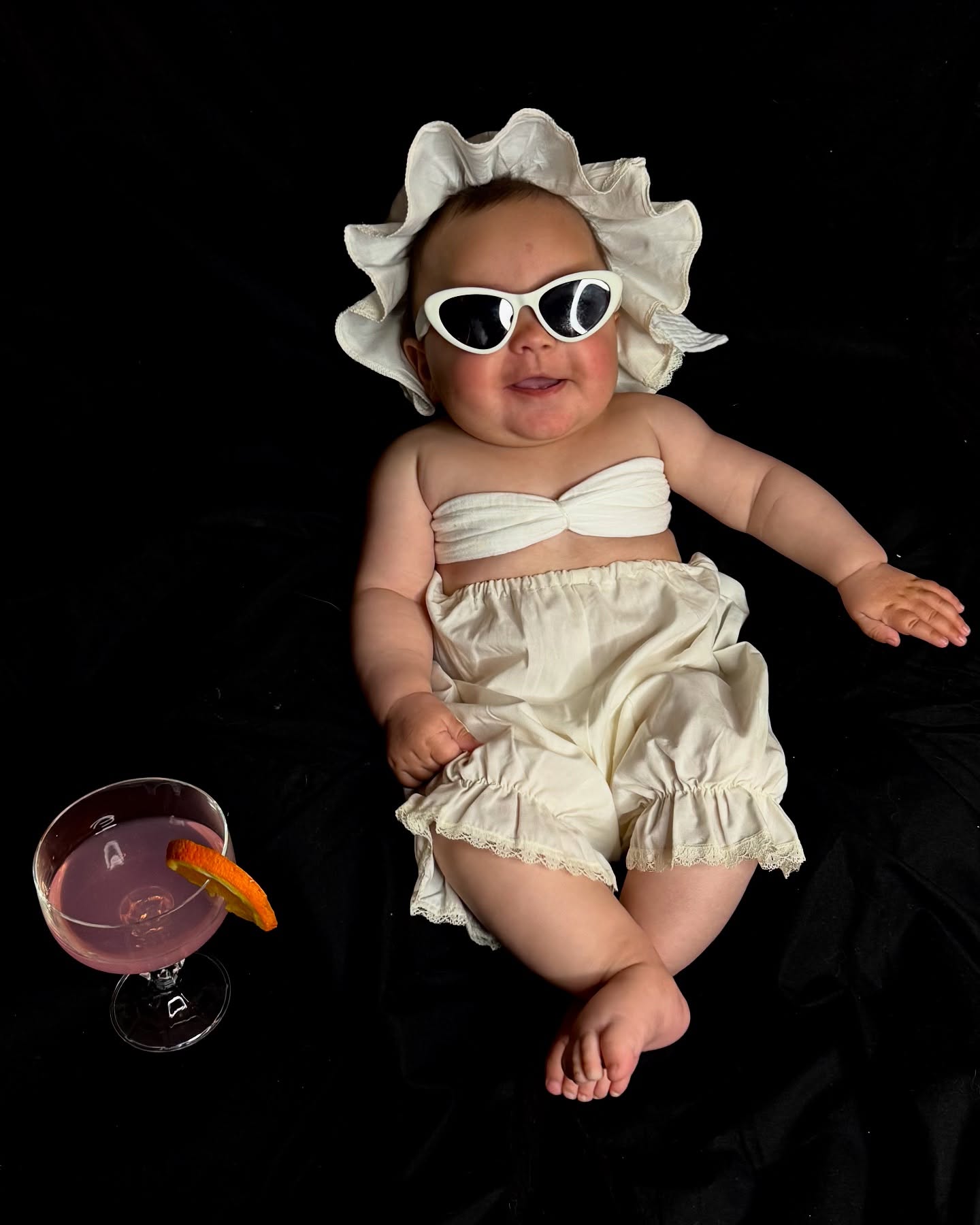 Pranë saj, një gotë me një pije rozë dhe fetë portokalli shton humorin e pushimeve luksoze, ndonëse të gjithë e dimë që kjo është thjesht për poza – diva e vogël ende nuk e ka mbushur as vitin!