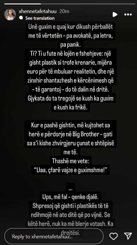 Ish banorja e BBVK, Xheneta, ka reaguar dje sërish pas publikimit të bisedave me Drilonin, për të sqaruar arsyet pse i ka ndarë ato video me ndjekësit – pasi ky i fundit ka vendosur të ndjekë rrugët ligjore.