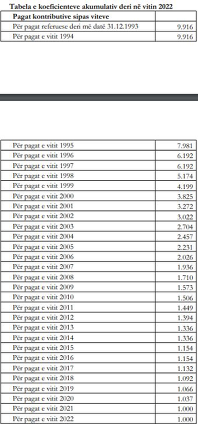 Në vendimin e qeverisë thuhet se pas aplikimit të këtyre koeficienteve paga e rivlerësuar për efekt pensioni, nuk mund të jetë më e lartë se: trefishi i pagës minimale në shkallë vendi dhe as më e lartë se paga maksimale. Kurse pas vitit 94’, koeficentët për pagat referuese janë të ndryshëm dhe nisin nga 9.8 herë për vitin 1995, dhe mbarojnë me 1.1 herë në vitin 2022. Nga ky vendim nuk përfitojnë ata që kanë dalë në pension para 1 korrikut, të cilët do të marrin rritje pensioni, nga indeksimi që pritet të bëhet në tetor të këtij viti.
