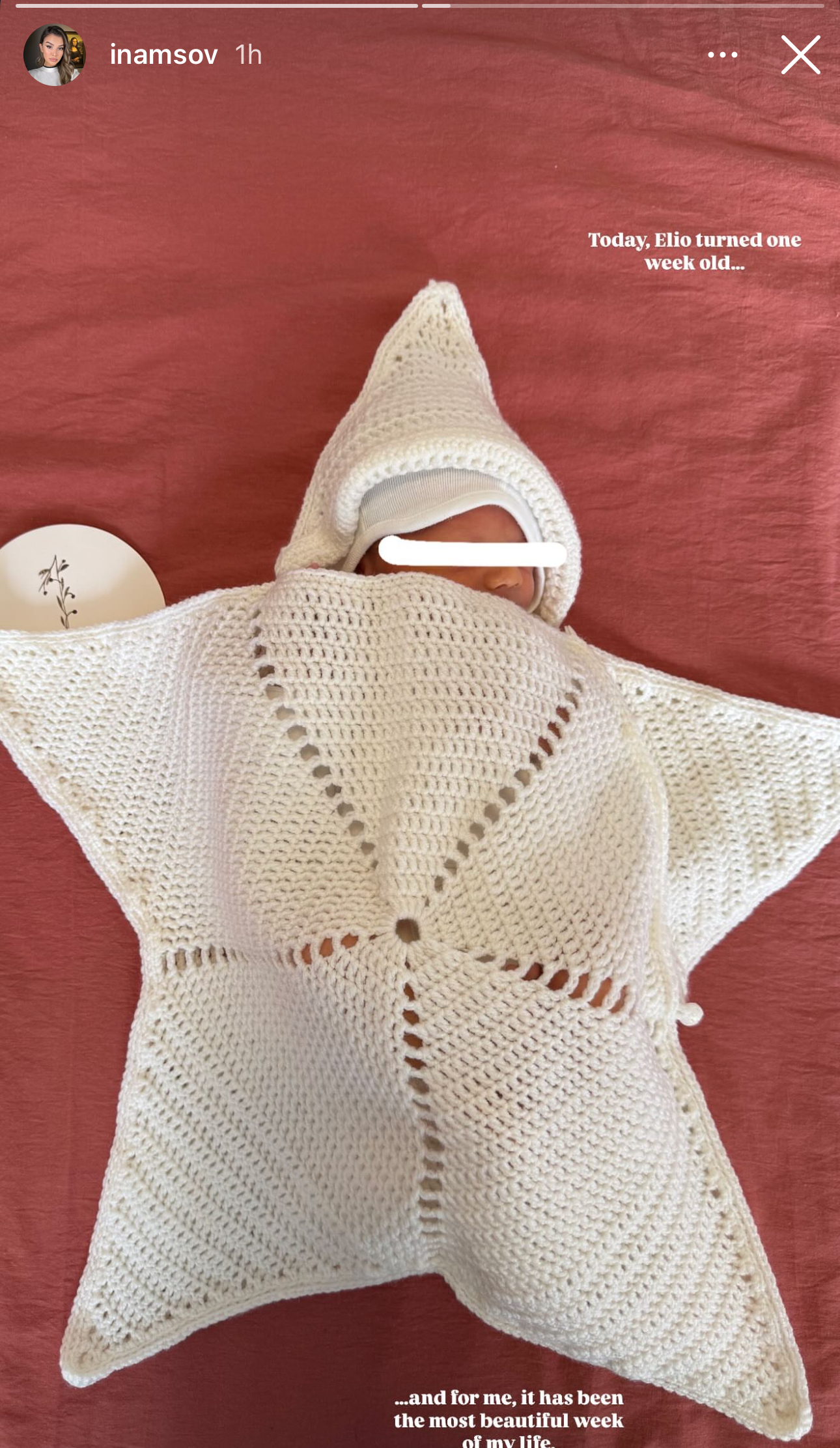 “Një javë që kur Elio erdhi në jetë. Për mua ka qenë java më e bukur e jetës sime”, ka shkruar në foton e bebes së cilës ia mbuloi vetëm sytë.