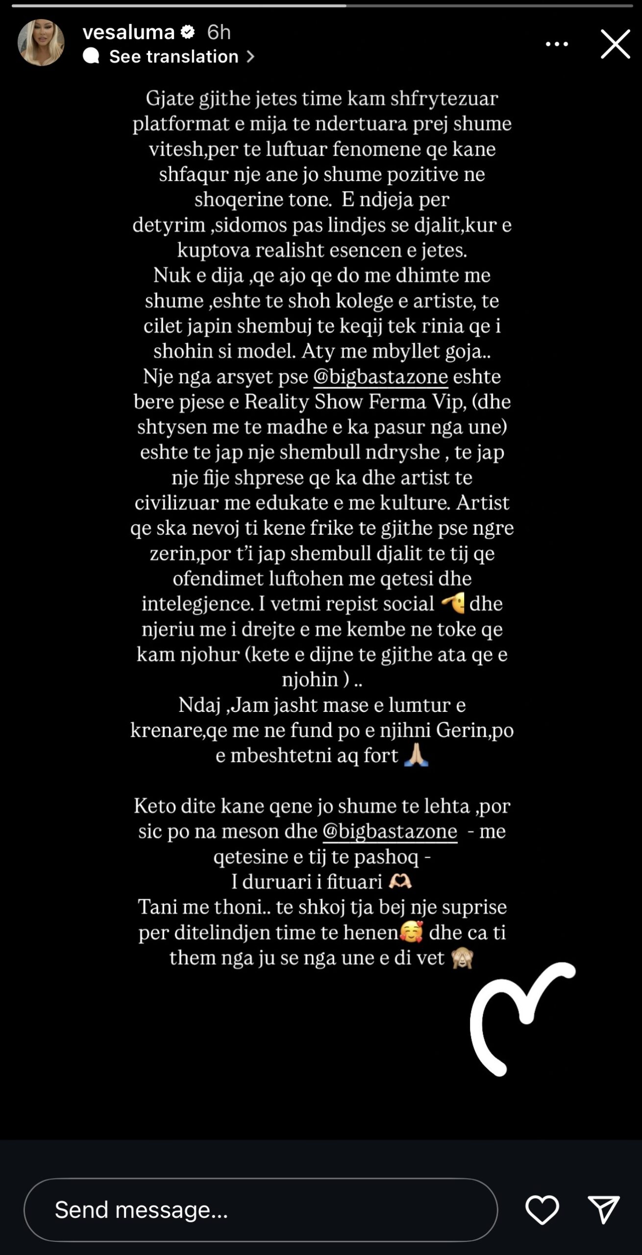 Edhe sot, Vesa Luma ka zgjedhur të dalë në mbrojtje të bashkëshortit të saj, përmes një InstaStory, ku ka lëshuar edhe disa kunja për të gjithë artistat.