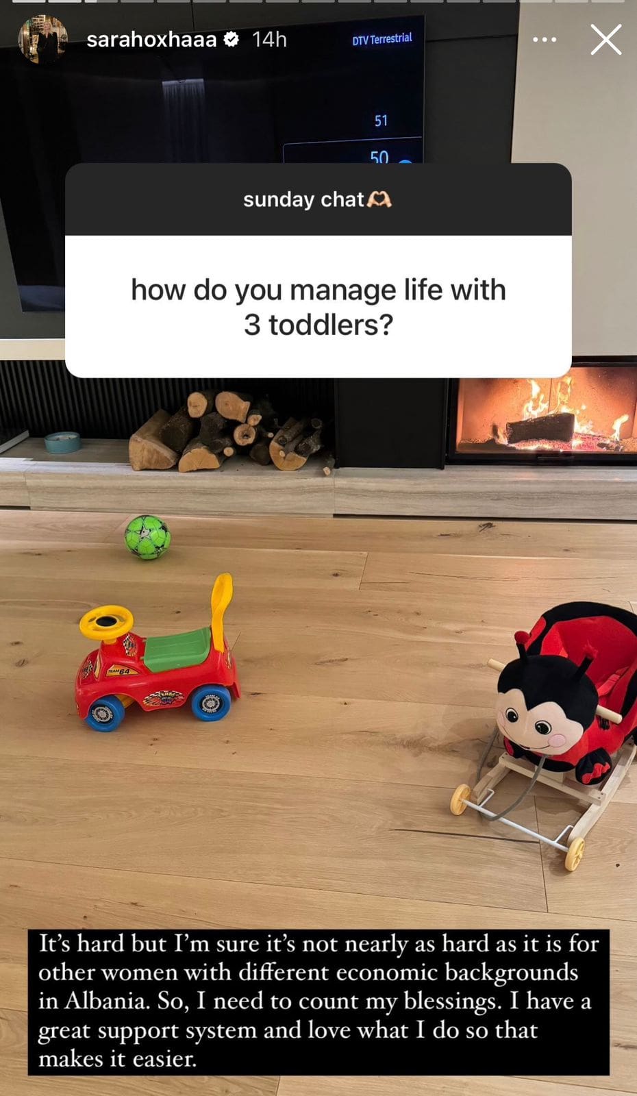 Nisur nga jeta private, ajo tregoi se falë suportit që merr dhe me sa shumë dashuri e bën atë gjë, të qenurit nënë e 3 fëmijëve nuk është edhe aq e vështirë për të.