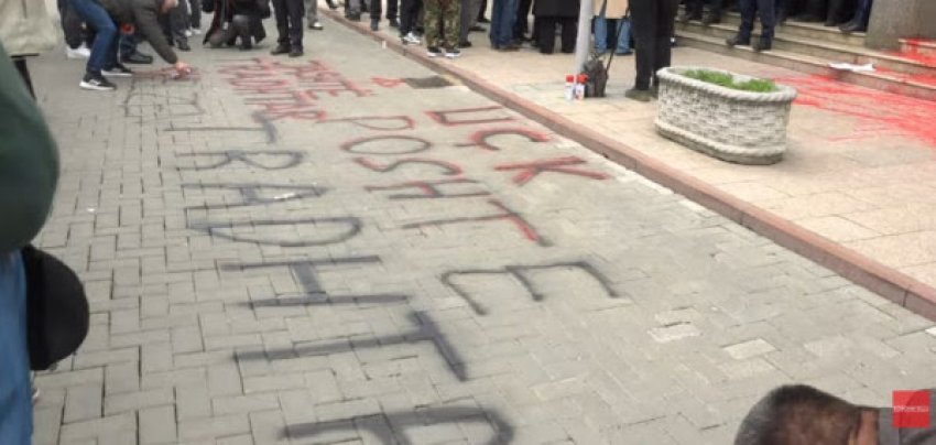 Protestuesit kanë hedhur ngjyrë të kuqe para hyrjes së Kuvendit të Kosovës, si dhe kanë shkruajtur me sprej kanë shkruar “Jashtë tradhtarët, poshtë tradhtarët”.